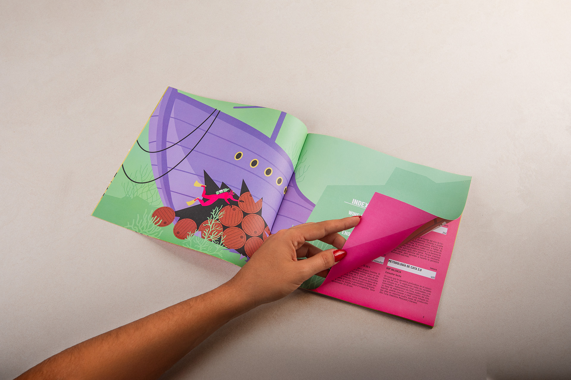 - Personajes y ambientes: No se trataba de dibujar peces, sino de crear elementos creíbles que contaran una historia. Para ello transformamos medusas en abrebotellas y creamos baúles del tesoro llenos de botellas de vino. Estos diseños contaban una historia visual y convertía objetos cotidianos en una metáfora.